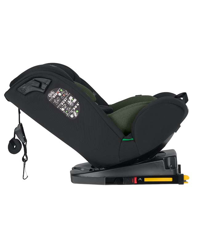 A rotação de 360° facilita a mudança de direção da cadeira e torna mais prática a entrada e saída da criança com conforto. Já o ângulo de reclinação na posição virada para a frente varia entre 102° e 114°, oferecendo três posições ajustáveis.