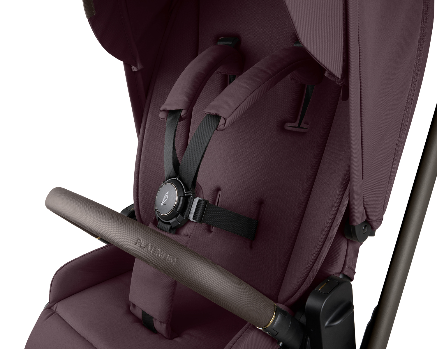 • Cinto de segurança de 5 pontos com fecho magnético, protetores de ombro e protetores de fivela inferiores;