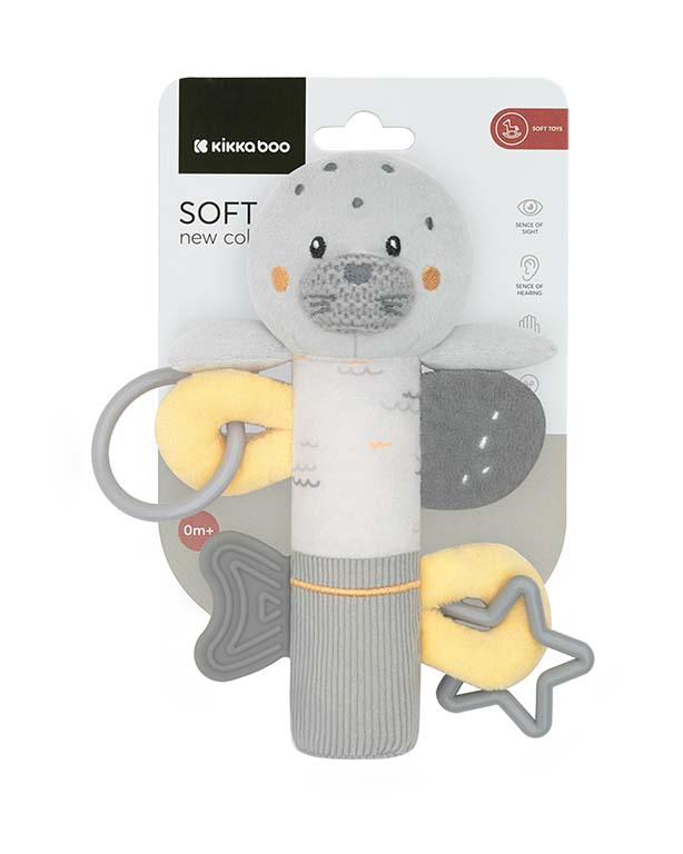 - Brinquedo macio com apito embutido e mordedor colorido;